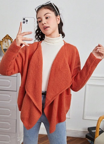 Однотонный, очень свободный длинный вязаный кардиган для молодых девушек.