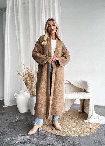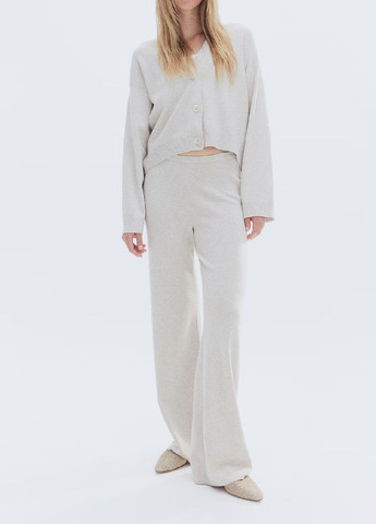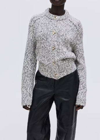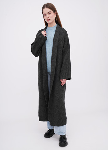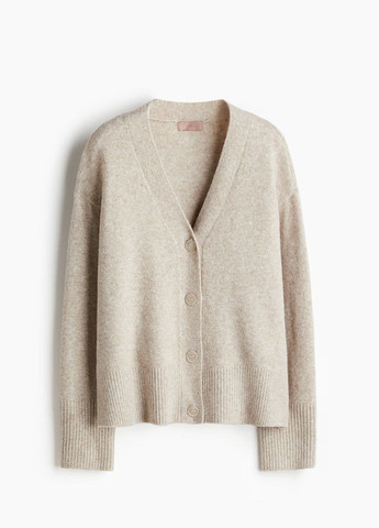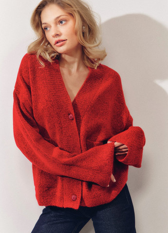 Кардиган из мягкой шерстяной пряжи. V-образный вырез, планка с пуговицами, спущенная линия плеча и длинные рукава. Ребристая отделка по горловине, планке с пуговицами, манжетам и подолу.
