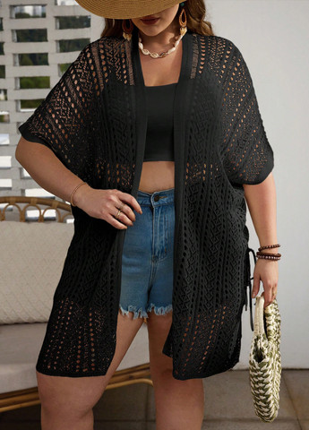 Кардиган SHEIN VCAY Plus Size. Этот свободный кардиган имеет простой дизайн с вырезами. Он включает в себя разрезную деталь. Кардиган имеет рукава «летучая мышь» и ткань средней эластичности.