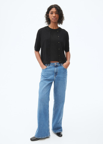 Мягкий трикотажный кардиган с короткими рукавами. Круглый вырез, застежка на пуговицы, ребристые манжеты и низ. Для размера XS: полуобхват груди 43 см, длина 52 см.