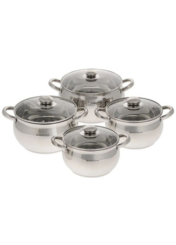 Универсальный набор кастрюль Bohmann BH-0508 4 кастрюли из нержавеющей стали Набор кастрюль Bohmann BH-0508 – это набор состоящий из 8 предметов. Изготовлено из качественной нержавеющей стали, крышки – из термостойкого стекла. В комплект входят самые необходимые предметы: 3 кастрюли разного объема и ковш весь набор оснащен стеклянными жаропрочными крышками. Нержавеющая сталь не окисляется, легко очищается, даже без использования сильнодействующих моющих средств, а также посуда из стали прослужит Вам долгое время. Такой набор станет отличным подарком для каждой хозяйки. Характеристики: Кол-во предметов: 8 Материал: нержавеющая сталь Тип источника тепла: газовый, электрический, керамический и индукционный Кастрюли: высококачественная нержавеющая сталь 18/10 Многослойное капсульное дно Диаметры изделий соответствуют общепринятым размерам конфорок бытовых плит Ручки: нержавеющая сталь, не нагреваются, прочные и безопасные Крышки: жаропрочное стекло с отверстием для выхода пара, ручка — нержавеющая сталь Подходит для всех видов кухонных плит Можно использовать в духовке Можно мыть в посудомоечной машине Комплектация: Ковш с крышкой, диаметр 16 х 10,5 см, объем 2.1 л Кастрюля с крышкой, диаметр 18 х 11,5 см, объем 2,9 л Кастрюля с крышкой, диаметр 20 х 12,5 см, объем 3.9 л Кастрюля с крышкой, диаметр 24 х 14.5 см, объем 6.5 л
