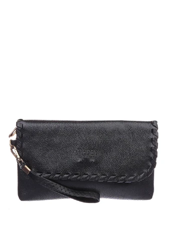 Застежка на молнию, внутри карман-перегородка на молнии, снаружи карман на молнии, съемная длинная ручка. Высота 15 см, ширина 24 см, глубина 2 см, длина ручки 140 см.