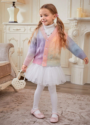 Этот кардиган подходит для юных девушек. Он украшен радужным омбре-узором и имеет V-образный вырез. Кардиган имеет длинные рукава и свободный крой. Рекомендации по уходу: ручная стирка или профессиональная химчистка.