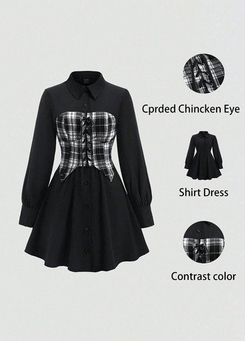 Мини-платье – Sweetro Plaid Floral Detachable Front Tie Waist Casual Shirt Dress. Это платье обычного кроя с воротником-стойкой и высокой талией. Включает шнуровку и люверсы. Ткань неэластичная с расклешенным подолом.