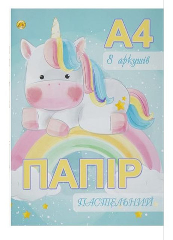 Это набор из 8 листов цветной бумаги в пастельных оттенках. Каждый листок имеет формат А4 и плотность 80 г/м2. Бумага мелованная и хранится в бумажной обложке, которая закреплена скобой. Он может использоваться для аппликаций, вырезок и склеивания.