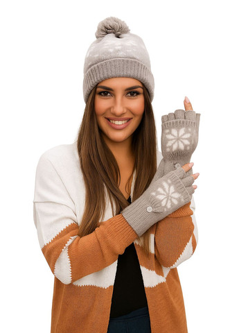 Стильный женский набор из вязаной шапки и перчаток-митенок в сером цвете – стильный выбор для холодного времени года. Шапка с помпоном мягко окутывает голову, обеспечивает тепло и комфорт, а перчатки удобно носить в двух положениях. Яркий зимний узор придает настроение. Серый оттенок универсален и легко сочетается с пальто, пуховиком или курткой, делая набор практичным аксессуаром для ежедневного использования. Этот зимний комплект станет надежным спутником в холодную погоду и отличным подарком, сочетающим стиль и функциональность.