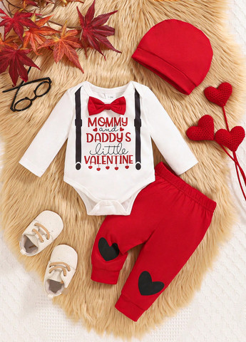 Этот комплект из 3 предметов для мальчика предлагает праздничный осенне-зимний наряд. Он включает в себя комбинезон с длинными рукавами с принтом в виде сердца и отделкой бантом. В комплект также входят штаны с принтом и соответствующая шапочка. Изделие изготовлено из слегка эластичной ткани и имеет круглый вырез.