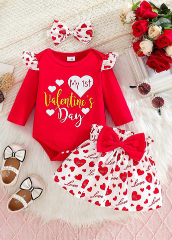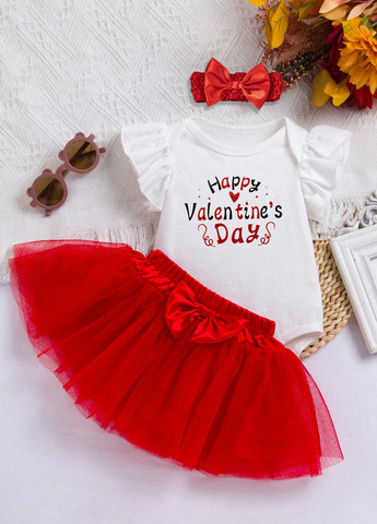 Этот комплект из 3 предметов — очаровательный наряд на День святого Валентина для девочек. Он включает в себя боди с напечатанными буквами, красную сетчатую юбку и повязку для волос. Наряд имеет стандартный крой с контрастной сеткой и оборками. Ткань средней эластичности.