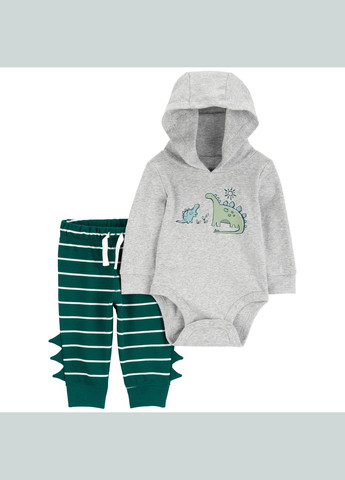 Комплект Carter's для мальчика состоит из боди и штанишек. Боди выполнен в сером цвете, имеет длинные рукава и капюшон, застегивается снизу на кнопочки, что облегчает процесс смены подгузника. Брюки выполнены в зеленом цвете, имеют манжеты и эластичный пояс со шнурком, что помогает регулировать посадку. Материал: боди – 60% хлопок, 40% полиэстер; штаны – 100% хлопок.