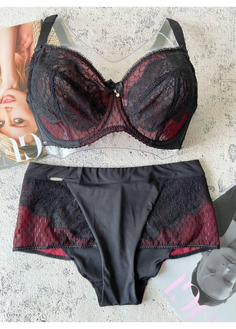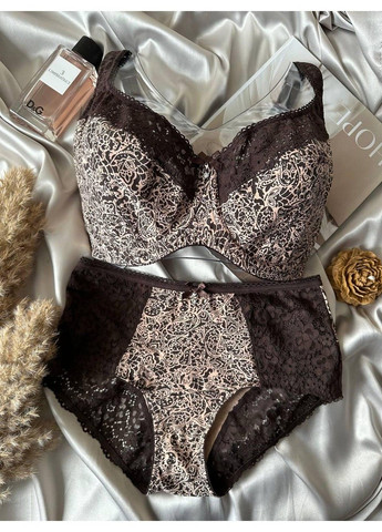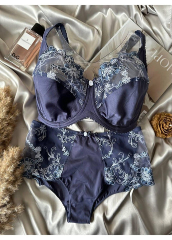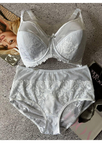 Нижняя часть чашек выполнена из прочного хлопкового корсетного материала с вертикальной стабилизирующей строчкой, что дополнительно поддерживает грудь. Верхняя часть украшена кружевом, которое красиво обрамляет бюст, придавая комплекту утонченность. Средняя часть бюстгальтера плотно прилегает к грудине, обеспечивая должную поддержку и разгружая позвоночник.