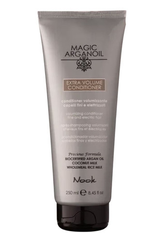 NOOK MAGIC ARGANOIL EXTRA VOLUME Conditioner – это легкий кондиционер для глубокого увлажнения и придания объема тонким и ослабленным волосам, склонным к электризации. Благодаря аргановому маслу, кокосовому и рисовому молочку, средство укрепляет, питает и защищает волосы от пересушивания. Основные преимущества: Интенсивно увлажняет тонкие и ослабленные волосы. Придает волосам объем без утяжеления. Улучшает упругость, эластичность и структуру волос. Распутывает волосы, облегчая расчесывание. Обеспечивает антифриз-эффект и предотвращает электризацию. Восстанавливает жизненную силу и делает волосы послушными. Дарит блеск, мягкость и легкость. Защищает волосы от потери влаги. Активные компоненты: Органическое аргановое масло – Питает, увлажняет и восстанавливает структуру волос. Придает блеск, мягкость и защищает от повреждений. Кокосовое молочко – Глубоко увлажняет, насыщает волосы питательными веществами, укрепляет и предотвращает ломкость. Рисовое молочко – Придает эластичность, улучшает текстуру и делает волосы мягкими и шелковистыми. Комплекс аминокислот – Укрепляет структуру волос, защищает от повреждений. Аромат: Легкая цветочно-фруктовая композиция с теплыми древесными нотами: Верхние ноты: свежие фруктовые аккорды цитруса и груши. Ноты сердца: нежный жасмин, орхидея и белая лилия. Базовые ноты: теплые древесные оттенки сандала, ванили и мускуса. Для кого этот продукт: Для обладателей тонких, ослабленных волос, нуждающихся в объеме, увлажнении и защите от электризации. Результат: Объемные, блестящие, мягкие волосы без электризации.