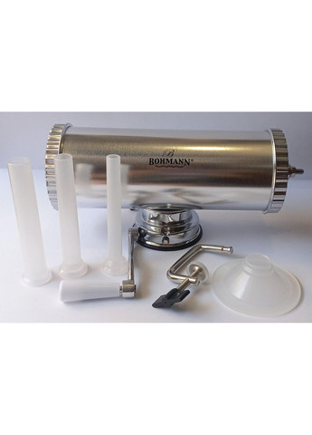 Шприц колбасный вертикальный объемом 4 кг. Шприц колбасный вертикальный для набивки колбас полезной емкостью 4 кг позволяет легко набить колбасную оболочку в домашних условиях. Шприц колбасный вертикальный для набивки колбас в домашних условиях. Принцип работы основывается на поступательном движении штока поршня. Привод колбасного шприца оборудован удобной ручкой. При вращении которой через зубчатую передачу двигается шток поршня. Простота устройства гарантирует удобную работу, чистку, мойку и длительный срок эксплуатации. Эта модель не так компактна, как горизонтальная модель колбасного шприца. Однако, вы приобретете достаточно профессиональную колбасную машину, которая своим футуристическим видом успешно впишется в кухонный интерьер. Порядок работы с колбасным шприцем: Приготовленный колбасный фарш плотно забей в цилиндрический корпус колбасного шприца; на раструб корпуса прикрепите насадку (струйку), соответствующую диаметру колбасной оболочки; натяните подготовленную оболочку на цевье; вращая ручки колбасного шприца, постепенно заполните мясным фаршем колбасную оболочку; при поступлении фарша колбасная оболочка будет сдвигаться вперед; завяжите с помощью колбасного шпагата на конце колбасной оболочки узелков; продолжая крутить ручку привода колбасного шприца, вы легко наполните фаршем всю колбасную оболочку; перевязывайте колбасным шпагатом по мере необходимости для придания эстетического и аккуратного вида вашей колбасе Вертикальный колбасный шприц наиболее производителен за горизонтальный и подходит для кафе, ресторанов и тех семей, которые готовят большие объемы колбасы. У вертикального колбасного шприца более надежное крепление, он более устойчив при наполнении колбасных оболочек. Технические характеристики Объем: 4 кг. фарша Материал: нержавеющая сталь Поршень: металл + силиконовая прокладка Крепление к столу: металлическая струбцина Насадки в комплекте: 5 шт 10,17, 21, 25, 29 мм Длина насадок – 150 мм Габаритные размеры: 180х180 подарочная коробка • Доставка 1-2 дня в зависимости от населенного пункта.