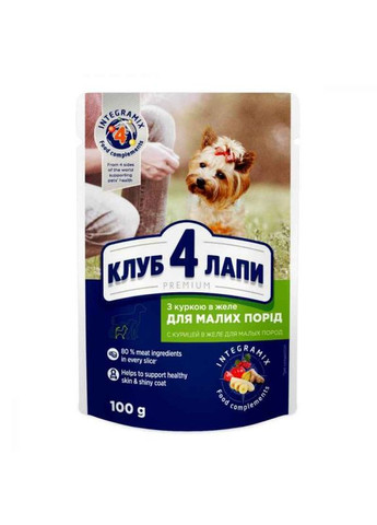 Полнорационный влажный корм с курицей Premium Adult Dog Small Breeds Chicken в аппетитном желе разработан для сбалансированного, ежедневного питания собак мелких пород старше 1 года. Консервированный корм обеспечит домашнему любимцу всеми необходимыми витаминами и питательными компонентами, которые позволят питомцу быть активным в течение дня. Рецептура разработана авторитетными специалистами в сфере кормов для животных в коллаборации с опытными украинскими ветеринарами. Преимущества: Высокий процент легкоусвояемого куриного мяса обеспечивает собаку протеинами и белками, что поддерживает его энергетический уровень; Высокое содержание кислот Омега-3 и Омега-6 улучшают состояние шерсти собаки и поддерживают ее умственную деятельность; Банан содержит высокое количество клетчатки и калия, оказывает положительное влияние на работу желудочно-кишечного тракта и нормализует работу печени; Имбирь способствует нормализации пищеварения, предупреждает газообразование и укрепляет иммунитет животного; Томаты нормализуют уровень холестерина в крови и полезны для кишечника собаки; Боярышник нормализует работу сердечно-сосудистой системы и давление; Ингредиенты богаты витаминами разных групп, которые положительно влияют на состояние иммунной системы организма и эффективно защищают его от вирусов и микробов. Состав: 80 % мяса и продуктов животного происхождения в кусочках, в частности из курицы 34 %, злаки, минералы, экстракты растительного белка, масла и жиры (масло из лосося 0,22 %), фрукты (банан 0,1 %, боярышник 0,03 %)*, овощи (*) 0,005%. Добавки (на 1 кг): витамины: D3 (3а671): 112 МЕ, Е (3а700): 22,2 mg (мг), В1 (3а821): 0,32 mg (мг), кальция Д пантотенат (3а841): 0,68 mg (м1,4) mg (мг), хлорид холина (3а890): 1,6 g (г); микроэлементы: цинк (3b604) 2,1 mg (мг), марганец (3b503) 1,56 mg (мг), йод (3b201) 0,32 mg (мг), селен (3b801) 0,1 μg (мкг); аминокислоты: таурин (3а370): 195 мг (мг), глицин (2b17034): 5,6 g (г); пищевые красители. *Натуральные ингредиенты, высушенные. Аналитические компоненты: сырой белок 7%, сырой жир 4%, сырая зола 2,5%, сырая клетчатка 0,5%, влажность 82%, кальций 0,32%, фосфор 0,26%, омега-3 жирные кислоты 0,1%, омега-6 жирные кислоты. Энергетическая ценность: 100 г/320,49 кДж (76,6 ккал). Нормы кормления: Хранить в сухом месте при температуре от +6 ºС до +30 ºС. Корм в открытой упаковке хранить в холодильнике не дольше 48 часов. Порция корма обязана быть комнатной температуры. Корм необходимо вводить в рацион постепенно (по крайней мере, в течение первых 5-ти дней). Обеспечить животному постоянный доступ к чистой питьевой воде. Индивидуальные нормы кормления могут изменяться в зависимости от возраста, породы, уровня активности и среды обитания животного. Комбинируйте кормление с сухими рационами. Вес взрослой собаки, кг Пакет влажного корма, 100 г Комбинированное кормление Пакет влажного корма, 100 г Сухой корм, г Пакет влажного корма, 100 г Сухой корм, г 2 2 1 20 2 0 4 3 ⅓ 1 45 2 2 5 ½ 1 90 2 70 10 6 ½ 1 110 2 90 Срок годности: 24 месяца с даты производства. Фасовка : 100 г. Производитель : Club 4 Paws, ООО "Кормотех", Украина