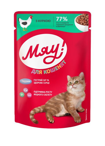 Влажный корм Мяу! для котят. Состав: мясо и субпродукты животного происхождения (в кусочках не менее 77%), в том числе из курицы не менее 8%, злаки (пшеница 6%), экстракты растительных белков, минералы, продукты растительного происхождения (петрушка) 0,001%. Добавки (на 1 кг корма): витамин Д3: 203 МЕ; витамин Е: 13,5 мг, витамин В1: 1 мг, фолиевая кислота: 0,26 мг, таурин: 534 мг, холин хлорид 60%: 1,26 г; микроэлементы: цинк сульфат гептагидрат: 13,6 мг, йодид калия: 0,47 мг, селенит натрия: 0,34 мкг, марганец сульфат моногидрат: 2,08 мг. Питательная ценность (аналитические компоненты) корма: сырой протеин-8%, сырой жир-5,2%, сырая зола-2,5%, сырая клетчатка-0,3%, влажность-80%, кальций-0,35%, фосфор-0,25%. Энергетическая ценность 100 г корма: 347,26 кДж (83 ккал). Срок годности: 24 месяца с даты производства. Хранить в сухом месте при температуре от +6 ºС до +30 ºС. Корм в открытой упаковке хранить в холодильнике не дольше 48 часов. Порция корма должна быть комнатной температурой. Корм необходимо вводить постепенно (по крайней мере, в течение первых 5-ти дней). Обеспечить животному постоянный доступ к чистой питьевой воде.