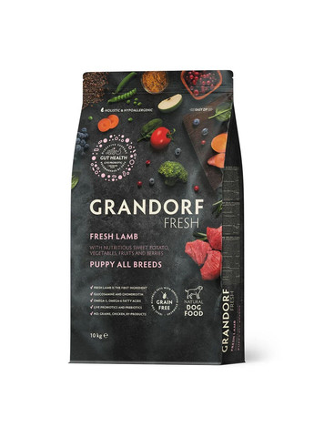 Сухой беззерновой корм Grandorf Fresh на основе свежего мяса ягненка и батата разработан специально для щенков в период активного роста. Рацион содержит только натуральные и легко усваиваемые ингредиенты, помогающие поддерживать здоровье пищеварительной системы и способствуют укреплению иммунитета. Сбалансированный состав обеспечивает все необходимые питательные вещества для здорового и активного роста щенка. Преимущества: Натуральное мясо ягненок как основной источник белка обеспечивает организм необходимыми аминокислотами. Высокое содержание батата – источники сложных углеводов и клетчатки для стабильной энергии и поддержания пищеварения. Комплекс витаминов и минералов поддерживает иммунную систему и развитие. Антиоксиданты в составе корма помогают защищать клетки от повреждений. Омега-3 и Омега-6 жирные кислоты обеспечивают здоровье кожи и качество шерсти. 1,000,000,000 КОЕ/кг живых пробиотических бактерий Enterococcus faecium на килограмм пищи, которые: Улучшают усвоение питательных веществ. Поддерживают здоровую микрофлору и способствуют выведению токсинов. Уменьшают риск расстройств пищеварения. Повышают иммунитет и стойкость к болезням. Нет побочных эффектов. Рекомендации по кормлению: норма потребления корма может изменяться в зависимости от активности, размера и условий содержания вашего питомца. Разделите суточную норму на несколько порций и всегда обеспечивайте доступ к свежей воде. Обратите внимание! В корм Grandorf не добавляются искусственные красители, поэтому в разных партиях цвет гранул может изменяться.