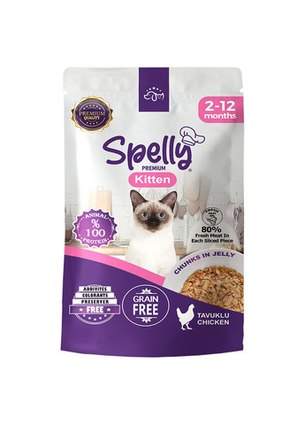Spelly – влажный корм для кошек в виде кусочков в желе. Влажный корм содержит 37% мяса и мясных ингредиентов, которые снабжают кота дополнительным источником протеина и мясной бульон. Благодаря современному процессу приготовления путем пропаривания и последующей подачи в желе все компоненты корма сохраняют максимум полезных свойств и естественный вкус. Содержит витамины Е, D3, которые в комплексе оздоравливают и укрепляют организм кота. С добавлением таурина – жизненно важной для кошек аминокислоты, отвечающей за сохранение острого зрения и здоровья сердца любимца. Не содержит красителей и консервантов. Состав: мясо и субпродукты мясного происхождения 37,4% (нарезанные кусочки составляют 10% рыбы), мясной бульон, травяной сбор, минералы и витамины. Без красителей и консервантов. Нарезанные кусочки обычно составляют 45% продукта. Белки 7,7%, Жиры 5,5%, Клетчатка 0,5%, Влажная 80%, Зола 2.2%. Дополнительные добавки: Таурин (3а700) 700мг/кг, Витамин А(3а672а) 2000 МЕ/кг, Витамин D3 (3а671) 150 МЕ/кг, Витамин Е (3а700) 45мг/кг, хлор000 хол (сульфат) (3b103) 27 мг/кг, Медь (сульфат) (3b405) 2 мг/кг, Марганец (оксид) (3b502)2 мг/кг, цинк (сульфат)(3b605) 25 мг/кг, йод (3b202) 0,45 мг/кг