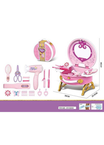 Для создания невероятных причесок, как у мамы ребенку понадобятся необходимые принадлежности, но пользоваться взрослым феном для волос еще очень рано, как быть? Мы представляем вашему вниманию невероятный набор парикмахера, который наполнен множеством аксессуаров и принадлежностей для создания самых стильных причесок. Особенности: набор выполнен в стильном розовом цвете: для хранения набор представлен в чемодане; когда ребенок откроет чемодан, то увидит красивое зеркало в форме сердца; чтобы активировать мелодию и подсветку зеркала, необходимо добавить две батарейки типа ААА; в чемодане есть фен и выравниватель волос, работают от 2х батареек типа ААА (имеют свет и фэндирует воздух); дополнительно в наборе аксессуары: бигуди, имитация плойки, заколки, расческа и ножницы; такой набор позволит почувствовать себя настоящим парикмахером. Размер упаковки: 36 см × 10 см × 25.5 см Упаковка: Пакет Возраст: от 3 лет