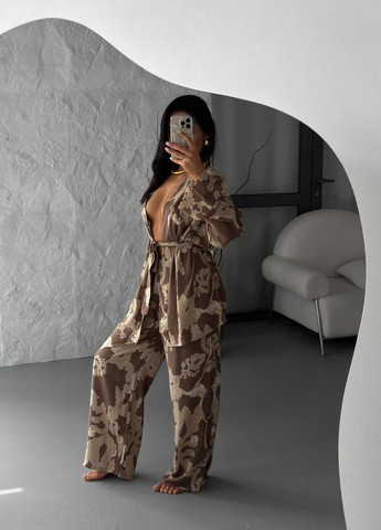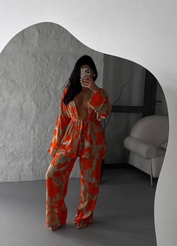 Длина блузы на размер XL: 64 см, длина рукава: 58 см, обхват груди: 104 - 106 см, длина брюк: 105 см, по внутреннему шву: 73 см, обхват талии: 78 - 84 см, обхват бедер: 104-106 см.