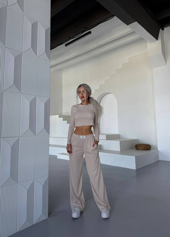 Льняной костюм. Брюки свободного кроя, высокая посадка, два прорезных кармана. Блуза с боковыми разрезами, широкие рукава с манжетами. Заниженная линия плеча.