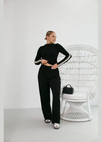 Костюм сочетает в себе комфорт спортивной одежды и элегантность широких штанов палаццо.