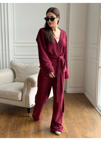 Женский костюм из ткани флис состоит из кофты в стиле кимоно и прямых брюк, создавая комфортный и стильный образ. Ткань флис обеспечивает тепло и удобство, идеально подходит для холодных дней. Прямые брюки добавляют в этой комбинации изящества, создавая баланс между кимоно-стилем верхней части и классическим кроем низа. Этот костюм идеально подходит как для повседневного использования, так и для официальных мероприятий, позволяя чувствовать себя комфортно и стильно в любой обстановке.