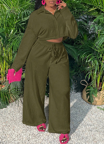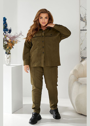 Женский демисезонный вельветовый костюм, изготовленный из вельвета микро, отличается высоким качеством. Рубашка застегивается на кнопки, а сзади на кокетке расположена принтованная накатка, что добавляет индивидуальности. Брюки свободного кроя с высокой посадкой, карманами и эластичными манжетами внизу подчеркивают современный и практичный образ.
