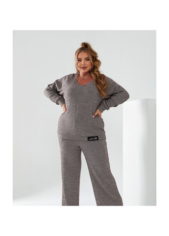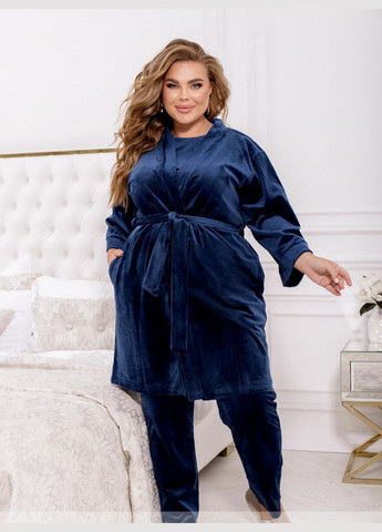 Стильный и комфортный костюм-тройка батал. В комплекте халат с карманами по сторонам, декорирован узором из страз на спине, застежек нет, в комплекте пояс, для него-две шлейки по сторонам. Футболка без застежек и карманов, на груди-узор из страз. Горловина полукруглая, рукава с небольшими мягкими манжетами. Брюки с высокой талией, вшитой до пояса резинкой и карманами в швах. Пояс/аксесиуар в комплекте. Ориентировочные замеры готового изделия: Халат: 50-52 р-р: длина кардигана 95 см, длина рукава от горловины 57 см, обхват рукава 44 см, ОГ-122 см, ОТ-122 см, ОБ-126 см. 54-56 р-р: длина кардигана 95 см, длина рукава от горловины 58 см, обхват рукава 48 см, ОГ-130 см, ОТ-128 см, ОБ-130 см. 58-60 р-р: длина кардигана 95 см, длина рукава от горловины 59 см, обхват рукава 52 см, ОГ-140 см, ОТ-138 см, ОБ-140 см. 62-64 р-р: длина кардигана 95 см, длина рукава от горловины 63 см, обхват рукава 54 см, ОГ-146 см, ОТ-146 см, ОБ-148 см. 66-68 р-р: длина кардигана 95 см, длина рукава от горловины 63 см, обхват рукава 58 см, ОГ-156 см, ОТ-152 см, ОБ-154 см. Футболка: 50-52 р-р: длина изделия: 68 см, обхват рукава 34 см, длина рукава от плечевого шва 28 см, ОГ-104 см, ОТ-100 см, ОБ-108 см. 54-56 р-р: длина изделия: 68 см, обхват рукава 38 см, длина рукава от плечевого шва 32 см, ОГ-112 см, ОТ-108 см, ОБ-114 см. 58-60 р-р: длина изделия: 69 см, обхват рукава 38 см, длина рукава от плечевого шва 33 см, ОГ-120 см, ОТ-116 см, ОБ-126 см. 62-64 р-р: длина изделия: 72 см, обхват рукава 42 см, длина рукава от плечевого шва 36 см, ОГ-128 см, ОТ-122 см, ОБ-134 см. 66-68 р-р: длина изделия: 72 см, обхват рукава 44 см, длина рукава от плечевого шва 36 см, ОГ-136 см, ОТ-132 см, ОБ-142 см. Брюки: 50-52 р-р: длина брюк по внутреннему шву 72 см, длина брюк по внешнему шву с учетом пояса 99 см, ОТ-76-108 см, ОБ-108 см. 54-56 р-р: длина брюк по внутреннему шву 72 см, длина брюк по внешнему шву с учетом пояса 101 см, ОТ-82-116 см, ОБ-116 см. 58-60 р-р: длина брюк по внутреннему шву 72 см, длина брюк по внешнему шву с учетом пояса 104 см, ОТ-88-124 см, ОБ-124 см. 62-64 р-р: длина брюк по внутреннему шву 74 см, длина брюк по внешнему шву с учетом пояса 106 см, ОТ-100-136 см, ОБ-136 см. 66-68 р-р: длина брюк по внутреннему шву 74 см, длина брюк по внешнему шву с учетом пояса 108 см, ОТ-110-144 см, ОБ-144 см.