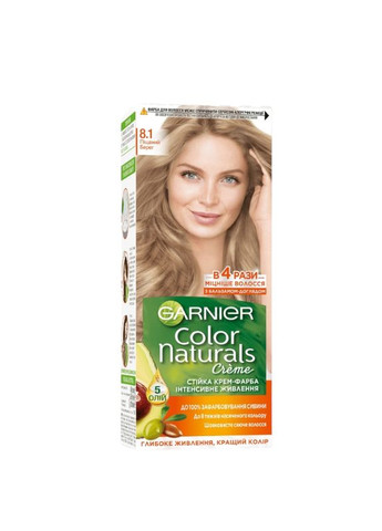 Устойчивая крем-краска для стойкого натурального цвета волос Garnier Color Naturals. Крем-краска обеспечивает питание волос до и после окрашивания. Ее формула обогащена тремя питательными маслами: оливковым, авокадо и карите. Краска имеет легкую кремообразную консистенцию и легко распределяется по волосам. Активные компоненты насыщают волосы питательными веществами, благодаря чему цвет насыщен до 8 недель. Теперь краска содержит на 20% больше бальзама-ухода. Результат: волосы шелковистые и блестящие, а цвет устойчив и насыщен до 8 недель.