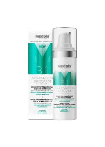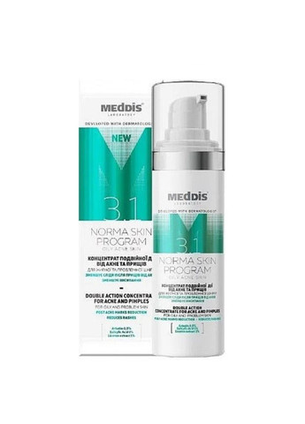 Лечащий концентрат Norma Skin Program поможет эффективно бороться с прыщиками, воспалениями и акне, устраняет пигментацию, выравнивает цвет лица. Пантенол и арбутин в составе уходового продукта позволяют улучшить заживление поврежденных участков кожного покрова, способствуют регенерации клеток эпидермиса. Бьюти-продукт обладает антибактериальным действием, препятствует развитию патогенной микрофлоры. Украинская фирма Meddis выпустила специальный концентрат , который заживляет воспаление на коже и препятствует появлению новых высыпаний. В магазине можно купить качественную брендовую продукцию. Применение: наносить на чистую кожу перед сном. Состав: Aqua, Alcohol Denat, Ppg-3 Myristyl Ether, Glycerin, Aluminum Starch Octenylsuccinate, Salicylic Acid, Hydroxy- Ethylcellulose, Glycyrrhiza Glabra Root Extract, Arbutin, Panthenol, Parfum, Phenoxy- Ethanol, Methylparaben, Propylparaben, 2-bromo-2-nitropropane-1,3-diol, Alphaiso- Methyl Ionone, Hydroxycitronellal, Limone- Ne, Hexyl Cinnamal, Citronellol