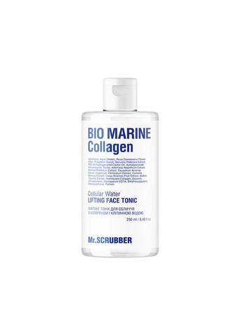 Лифтинг тоник для лица Bio Marine Collagen с коллагеном и клеточной водой успокаивает, зрительно подтягивает и укрепляет кожу, улучшает цвет и текстуру. Клеточная вода нейтрализует действие свободных радикалов, улучшает клеточный иммунитет и усиливает защитные механизмы, поддерживает микробиом кожи. Коллаген компенсирует дефицит белка, делает кожу свежей и нежной. Как работает: гидролат розы деликатно увлажняет и тонизирует кожу, успокаивает ее после долгого пребывания на солнце или ветре, устраняет следы усталости, выравнивает тон и микрорельеф, ускоряет обновление и предотвращает преждевременное старение; клеточная вода укрепляет кожный барьер, обеспечивает глубокое увлажнение, свежий вид и улучшенный цвет; касторовое масло уменьшает воспаление, подсушивает дерму, осветляет тон лица; акваксил восстанавливает водный баланс кожи, устраняет раздражение и шелушение, выравнивает и разглаживает микрорельеф; экстракт полыни успокаивает, устраняет красноту и воспаление, сужает поры, увлажняет и питает; экстракт тысячелистника тонизирует, освежает, восстанавливает эпидермис; экстракт хвоща выравнивает кожу, устраняет отеки, не оставляет жирного блеска; экстракт зверобоя оказывает антисептическое и противовоспалительное действия, уменьшает видимость пор, ускоряет заживление микроповреждений; экстракт зеленого чая успокаивает, восстанавливает, усиливает защитные свойства кожи, сохраняет ее свежесть и молодость; экстракт апельсина устраняет отеки, нейтрализует действие свободных радикалов; экстракт стада уменьшает количество и плотность высыпаний, оказывает успокаивающий эффект; морской коллаген компенсирует недостаток белка в эпидермисе, делает кожу свежей и упругой; глицерин увлажняет кожу и усиливает действие других составляющих. Эффект: устранение сухости, шелушение, покраснение; восстановление природного уровня pH; улучшение эластичности, повышение упругости. Состав: Aqua (Water), Rosa Damascena Flower Water, Propylene Glycol, Spirulina Platensis Extract, PEG-40 Hydrogenated Castor Oil, Xylitylglucoside, Anhydroxylitol, Xylitol, Artemisia Absinthium Extract, Achillea Millefolium Extract, sis Extract, Citrus Sinensis Fruit Extract, Bidens Tripartite Extract, Hydrolyzed Collagen, Glycerin, Phenoxyethanol, Chlorphenesin, Dipotassium EDTA, Ethylhexylglycerin, Phenoxyethanol, Parfum. Нанести тоник на ладони или ватный диск и равномерно распределить по лицу. Двигаться по массирующим линиям. Использовать дважды в день, утром и вечером.