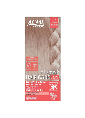 Тонирующая маска для волос Acme Color Hair Care Ton oil mask обладает эффектом ламинирования, предотвращает ломкость, сухость и повреждение волос, защищает от воздействия внешней среды. Натуральные масла, входящие в состав маски, питают, придают блеск и жизненную силу волосам. Увлажняет волосы и кожу головы, нормализует рН. Идеальное дополнение к вашей краске. Поддерживает цвет волос между процедурами окрашивания. Применение: вымыть волосы шампунем и просушить полотенцем на влажные волосы по всей длине равномерно нанести маску прочесать волосы расческой и оставить на 30 минут тщательно смыть теплой водой Частота применения: по необходимости. Для стойкости оттенка рекомендуется использовать средства по уходу за окрашенными волосами. При работе со средством используйте перчатки