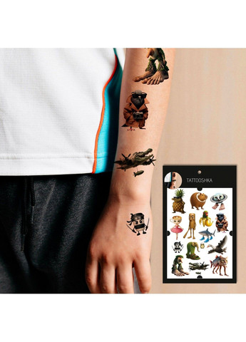 Подробная инструкция, как наносить переводное тату: 1.Участок кожи должен быть чистым и сухим. Для этого рекомендуем протереть место, где будет тату обезжиривающим раствором. К примеру, спирт или антисептик идеально подойдут для этого. Этот этап не обязателен, мы рекомендуем так делать, чтобы татушка продержалась дольше на теле. Особо рекомендуем обезжиривать кожу, если за 24 часа до этого вы использовали крем или масло для тела; 2. Вырезаете дизайн, который хотите нанести (если на тату листе несколько дизайнов); 3. Снимаете защитную пленку; 4. Прилагаете бумагу к телу, стороной где рисунок; 5. Смачиваете обычной водой или влажной салфеткой, легко придавливая бумагу к телу. Воды должно быть достаточно, чтобы бумага полностью намокла; 6. Осторожно снимаете бумагу. Готово!) Дополнительные советы: Желательно избегать участков кожи, где волосы очень густые. В таких местах тату продержится меньше времени; Сразу после нанесения, временное тату может немного давать блеск, он в течение 30-60 мин полностью исчезнет и тату будет выглядеть как настоящее; Если сразу после нанесения временного тату есть ощущение стянутости кожи, просто дополнительно смочите тату водой. Стянутость означает, что недостаточно воды и тушке было при нанесении. В любом случае это ощущение проходит в течение 20 30 минут. Чтобы тату держалось дольше, желательно 30 минут после нанесения не тереть его, не пережимать одеждой. Если соблюдать все советы временные тату держатся идеально 3-7 дней, а могут и до 2-х недель, в зависимости от места нанесения. (По пальцам, на запястье, на шее меньше. На остальных телах длиннее). Чтобы снять временную тату, нанесите на него детское масло или спиртовой раствор (например, антисептик), подождите 15 20 секунд и осторожно протрите Характеристики: - Габариты: длина: 18 - Габариты: ширина: 0.01 - Габариты: высота: 9 - Состояние: новое: Цвет: Различные цвета - Упаковка: Полиэтиленовый пакет - Вид: Временные татуировки - Тематика: Мультфильмы - Возраст: От 6 лет - Гарантия: 14 дней - Пол: Унисекс - Страна регистрации бренда: Украина - Страна-производитель товара: Украина