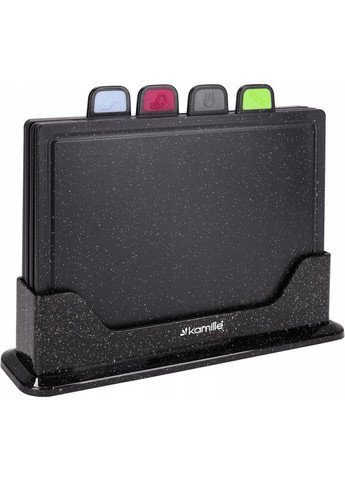 Комплект разделочных досок Kamille — это идеальный выбор для тех, кто ценит качество и удобство на кухне. Этот набор из четырех разделочных досок, выполненных из высококачественного твердого пластика, станет незаменимым помощником в приготовлении пищи. Каждая доска имеет размеры 29x23 см и толщину 0.6 см, что делает их идеальными для нарезки различных продуктов, от овощей до мяса. Доски стилизованы под черный гранит, что придает им современный и элегантный вид. Специальные бортики и бороздки на основании удерживают сок и крошки, что позволяет поддерживать чистоту на рабочей поверхности. Яркая маркировка на каждой доске помогает легко разделить продукты по типам, что особенно важно для соблюдения гигиенических норм при приготовлении пищи. Преимущества: Высокое качество: изготавливаются из прочного твердого пластика, что обеспечивает долговечность и устойчивость к повреждениям. Гигиеничность: легкая маркировка и возможность мытья в посудомоечной машине делают эти доски удобными в использовании. Безопасность: специальные силиконовые ножки предотвращают скольжение по столешнице, обеспечивая дополнительную устойчивость. Компактность: набор поставляется с подставкой для удобного хранения и сушки, что экономит место на кухне. Этот комплект разделочных досок предназначен для всех, кто любит готовить — от домашних кулинаров до профессиональных поваров. Он идеально подходит для ежедневного использования и поможет вам легко и быстро справляться с любыми кулинарными задачами. Не упустите возможность сделать вашу кухню более функциональной и стильной с комплектом разделочных досок Kamille!