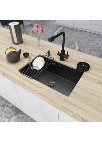 Компания Santeh Misto предлагает своим покупателям невероятное предложение – Комплект кухонной мойки Nett NB-78х48(L) PVD Черная– это стильное и функциональное решение для вашей кухни, которое идеально сочетается по цветам и материалам. Приобретение готового комплекта – это гораздо проще, быстрее и экономнее, чем покупать каждый элемент в отдельности. Вы получаете: Стильный дизайн и идеальная совместимость между мойкой и смесителем Существенную экономию средств и времени В состав набора входят: кухонная мойка из нержавеющей стали смеситель встроенный диспенсер сифон, слив-перелив, корзинный вентиль, сушилка Особенности мойки с левым боковым крылом Высококачественная сталь Мойка с боковым крылом изготовлена из премиальной нержавеющей стали AISI 304. Содержание хрома и никеля в данной стали выше, чем в AISI 204, что обеспечивает превосходные эксплуатационные качества. Повышенная толщина С толщиной в 1 мм, мойка обеспечивает отсутствие нежелательного звона при использовании и гарантирует долгий срок службы. Простота в уходе Скругленные внутренние углы и специальный наклон дна облегчают процесс уборки, предотвращая застой воды. Черное покрытие Мойка с крылом окрашена в черный цвет и обработана специальным Nano PVD покрытием, устойчивым к царапинам и коррозии. 10-летняя гарантия Раковина обладает высокой устойчивостью к агрессивным веществам и температурным изменениям, сохраняя свой идеальный вид на протяжении многих лет. Эксклюзивное предложение в Украине! Мойка с крылом оснащена отверстиями для ножей, исключая необходимость в дополнительных подставках и сохраняя чистоту вашей кухонной зоны. Бонус: бесплатный сифон! При покупке мойки вы также получите сифон из нержавеющей стали AISI 304, позволяющий сэкономить средства на другие нужды вашего дома! Характеристики Цвет Черный металик Материал Нержавеющая сталь 304 Вид монтажа Врезной Глубина изделия, мм 780*480*230 мм Габариты изделия, мм 780*480*230 мм Толщина материала, мм 1.5 мм Гарантия 5 лет Вес нетто, кг 7 кг Модель NB-7848(L) Ширина шкафа для монтажа, мм. 70-80 см Кухонный кран с системой фильтрации воды - незаменимый элемент в каждом доме! Смеситель для кухни "Frosh" сочетает в себе великолепный дизайн и высококачественные технические характеристики. Этот кран легко удовлетворит самые требовательные требования к сантехнике, став отличным дополнением для любой современной кухни. Особенности кухонного смесителя с системой фильтрации Многофункциональность смесителя с интегрированным фильтром Этот смеситель можно подключить одновременно к водопроводной и фильтрованной воде. Регулировка потока воды осуществляется двумя рычагами: для фильтрованной воды и для смешивания горячей и холодной воды. Стильный черный смеситель Все компоненты смесителя имеют элегантное черное покрытие, позволяя ему гармонично вписаться в интерьер кухни с любым дизайном. Минимум соединений Уменьшение количества соединений и переходов обеспечивает увеличение срока службы смесителя, предотвращая его быстрый износ. Изготовлено из нержавеющей стали Смеситель изготовлен из материалов высокого качества, обеспечивающих его долговечность и сохранение привлекательного внешнего вида. Качество "сделано в Германии" Массивность и надежность смесителя отражают его высокое качество. Он изготовлен в соответствии со строгими междуна