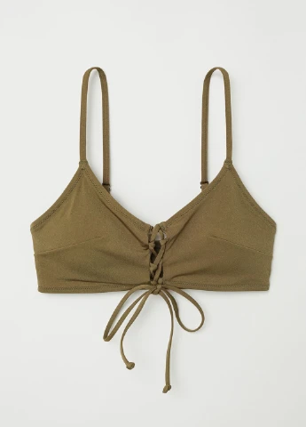 Лиф бикини на подкладке, чашки с вынимающимися вкладышами. Узкие регулируемые бретели и шнуровка спереди. Возможно повреждение бирки.