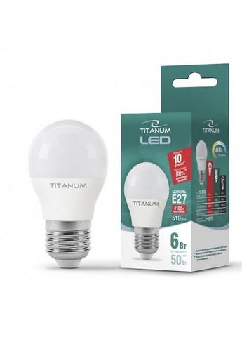 LED лампа TITANUM G45 6W E14 4100K - высокотехнологичный источник света. Обеспечивает ровный поток света и максимальную мощность с первой секунды работы. Предназначена для всеобщего освещения помещений, торговых залов и витрин, промышленных предприятий. Идеальна для декоративного, местного и направленного освещения. Используется во всех видах бытовых светильников. Имеет длительный срок эксплуатации и высокую стойкость к нагрузкам при включении и выключении. Особенности - Энергоэффективность освещения (A+). - Защита от скачков напряжения в диапазоне от 220 до 240В. - Равномерное яркое освещение без мерцаний, функция мгновенного Эффективный теплоотвод через корпус лампы - Ресурс работы – 20 000 часов. Гарантия 1 год. Энергосберегающие LED лампочки имеют высокую светоотдачу (85Лм/Вт). Световой поток-510Лм. Комфортный для глаз свет, не приводит к усталости и не ухудшает эмоциональное состояние, благодаря естественной цветопередаче (Ra>80) и отсутствию ультрафиолетового излучения. Белый свет (4100К), создает яркое и комфортное освещение, приближенное к дневному. Надежный драйвер, установленный в лампе, значительно увеличивает срок службы, убирает мерцание и защищает лампочку от скачков в электросети. Лампа светит мягко, без резких теней, угол рассеяния – 210°. В состав этой лампы не входит ртуть и другие вредные вещества. Срок пригодности к использованию не ограничен. Не подлежит утилизации в виде бытовых отходов.