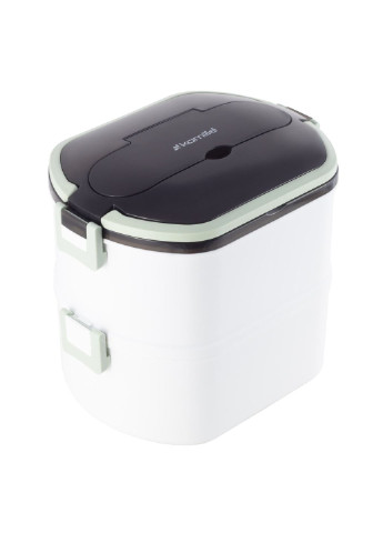 Ланч-бокс Kamille Snack (Lunch Box) – надежный и яркий помощник для транспортировки домашних обедов. Общий объем: 1500 мл. Качественный и компактный, он незаменим для школьников и офисных работников, для коротких поездок на природу и для длительных прогулок с ребенком. Яркий эксклюзивный дизайн пластикового корпуса. Ланч-бокс имеет отсек для транспортировки столовых приборов, 4 съемные емкости из пищевой нержавеющей стали, защищенные дополнительным чехлом из пластика, а под крышкой над емкостями может помещаться, например, хлеб или салфетки. Надежная внутренняя емкость из нержавеющей стали – материал, устойчивый к воздействию кислот и щелочей, не изменяет вкуса и цвета пищи. Легкий и крепкий контейнер из нержавеющей стали не подвергается коррозии и не окисляется, что обеспечивает безопасность для здоровья и длительный срок службы. Ланч-бокс имеет безопасный замок, плотно прижимающий крышку во избежание разливки и удобную ручку для переноски. Кроме того, контейнеры имеют дополнительные крышки непосредственно на емкости. Цвет наружного контейнера белый с зеленым, овальная форма. Не подходит для разогрева в микроволновках. Серия: Snack; Материал: Наружная часть корпуса пластиковая, внутренняя из нержавеющей стали. Ручки пластиковые; Объем: 1500 мл; Крышка: Пластиковая с ручкой и защелками; Комплектация: 4 емкости, 5 крышек; Посудомоечная машина: Нет;