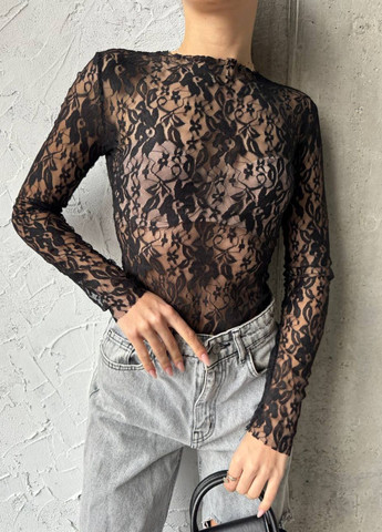 Гипюровый лонгслив с длинными рукавами и круглым воротником. Ткань: гипюр/сетка стрейч