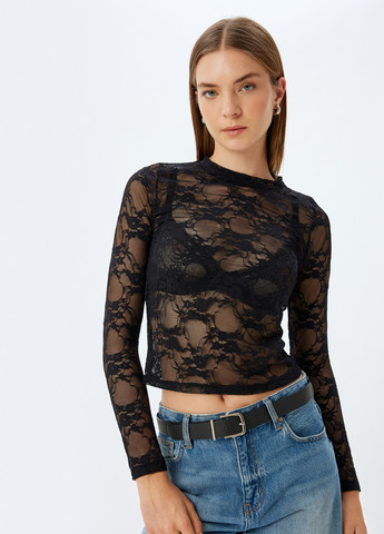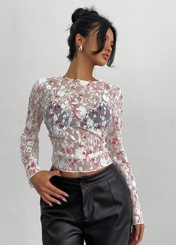 Выполнен из мягкого эластичного гипюра с цветочным узором, красиво подчеркивающим силуэт и придающим образу изысканности. Модель имеет вшитый длинный рукав и округлый вырез горловины, что делает ее универсальной – можно носить с жакетом, корсетом, топом или под платье.