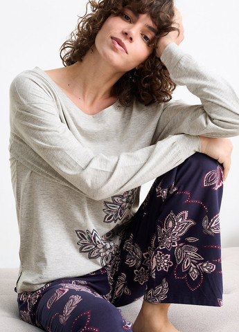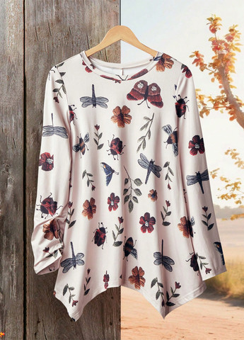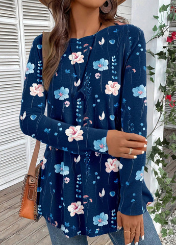 Лонгслив для беременных и кормящих матерей в стиле пэчворк. Эта футболка, вдохновленная осенью, имеет облегающий крой. Она имеет мелкий цветочный принт и круглый вырез. Футболка имеет дизайн с запахом и детали из резинки. У нее обычные рукава и расклешенный подол. Ткань средней эластичности.