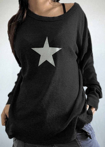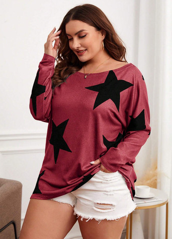 Футболка с длинным рукавом со звездным принтом — Plus Size. Эта футболка имеет звездный принт и рукава «летучая мышь». Она имеет свободный крой и рукава с заниженной линией плеча. Ткань средней эластичности с обычным подолом. Имеет воротник-стойку.
