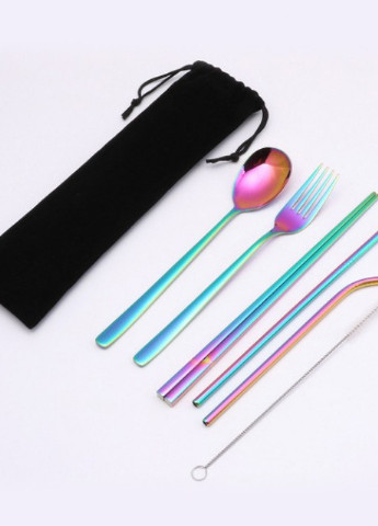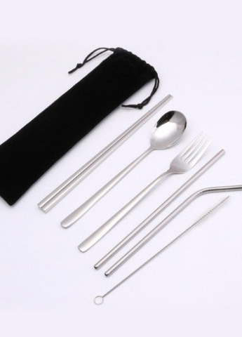 Стильные металлические приборы ложка, вилка, палочки с двумя трубочками и щёткой в удобном футляре Характеристики: Материал: Нержавеющая сталь Набор состоит из 6х предметов и черного чехла: Вилка - 20.6*2.2 см Палочки - 23 см Прямая трубочка - 21,5 см Изогнутая трубочка - 21,5 см Подходят для мытья в посудомоечной машине Не использовать абразивные моющие средства, жесткие щётки