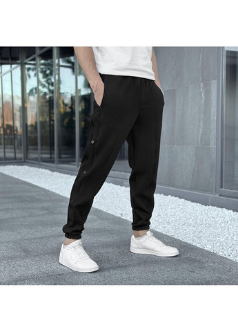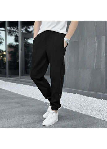 Манжеты на резинке в нижней части штанин обеспечивают плотное прилегание к лодыжкам, что придает удобству и подчеркивает спортивный стиль. Декоративные кнопки, расположенные по бокам брюк по всей длине, придают оригинальный вид, хотя не имеют функционального назначения.