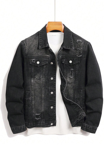 Мужская джинсовая куртка Manfinity LEGND с рваными краями. Эта чёрная джинсовая куртка с воротником и длинными рукавами имеет однобортный крой и карманы. Предназначена для повседневной носки. Рекомендации по уходу: ручная стирка.