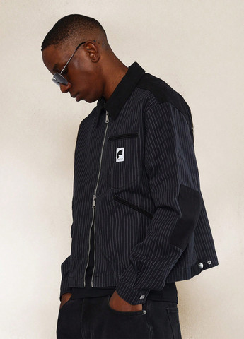 SUMWON Stripe Twill Crop Zip Through Denim Jacket. Эта джинсовая куртка свободного кроя выполнена из полосатой саржи. Она имеет застежку-молнию и нашивки. Куртка имеет вшитые рукава и обычное разделение. Есть воротник-стойка.