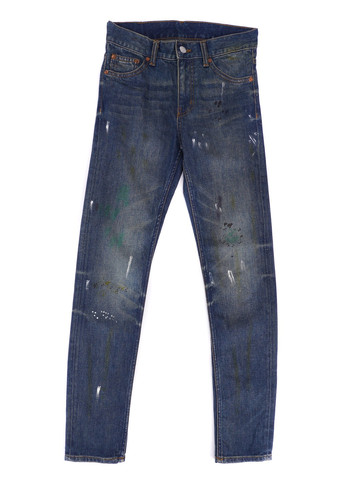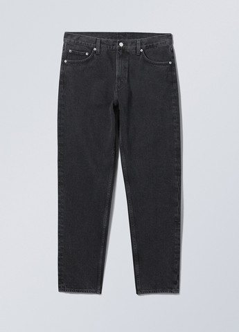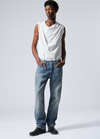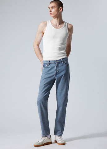 Пара зауженных джинсов свободного кроя, изготовленных из жесткого денима из органического хлопка, дополненного переработанным хлопком. Они имеют среднюю посадку и имеют классические пять карманов, застежку на пуговицах и сложенные края. На модели одет размер 31/32, обхват талии 88 см и внутренний шов 79 см.