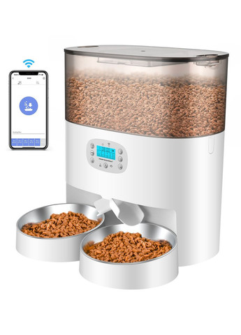 Современная смарт кормушка для домашних животных позаботится, чтобы ваш питомец был сыт даже когда вас нет дома или вы завалены делами. Достаточно просто выбрать количество корма и время кормежки, все остальное сделает автоматика. Регулируемый размер и время приема пищи. Автоматическая кормушка может планировать до 6 приемов пищи в день и выдавать от 1 до 24 порций (макс. 12 порц. на 1 миску), приблизительно по 6 граммов на одну порцию (зависит от размера и веса самого корма). Корм высыпается одновременно в каждую миску. Емкость для хранения сухих кормов - 3.5 литра. Размер корма должен быть 0,2-1,5 см, иначе он может застрять. После того, как вы запрограммировали графики кормления, они будут постоянно соблюдаться, даже когда устройство выключено.(при наличии батареек) Двойной источник питания. Автоматическая кормушка HoneyGuaridan поддерживает 3 батареи типа D и адаптер постоянного тока. В случае отключения электроэнергии кормушка продолжит работать от батарей, чтобы обеспечить кормление вашего питомца (батарейки в комплект не входят). При питании через батарейки модуль WiFi не активен. Все настройки сохраняются и кормушка выдает корм в соответствии с заданным графиком. Голосовые сообщения. Этот автоматический дозатор корма для домашних животных оснащен встроенным диктофоном и динамиком, с помощью которых вы можете призывать своих питомцев поесть записав 10-секундного сообщения. Если вам не нужна запись голоса, вы можете удалить ее. Эргономичная панель управления. Удобная панель управления, простая в настройке. Кнопки с защитой от прикосновения, для предотвращения от случайного прикосновения вашим питомцем. Также есть ручной режим кормления, чтобы давать корм для домашних животных в любое время. Легко разбирается и чистится. Съемный контейнер для корма и конструкция чаши из нержавеющей стали, легко устанавливаются и чистятся. Чашу можно легко мыть в посудомоечной машине. Примечание! Не рекомендуется, чтобы кормушка работала исключительно на батарейках. Батарейки следует использовать в качестве резервного питания. Характеристики: Материал: ABS Пластик, Нержавеющая сталь; Размер: 43* 18,5* 28,5см; Емкость: 3,5 л (~1,6 кг); Мотор: Срок службы - 20 000 часов; Количество: 6 приемов пищи, до 24 порций на прием пищи; ≈ 6 г на порцию (зависит от размера и веса самого корма) Категория корма: сухой корм для собак или кошек; никаких консервированных или влажных кормов; Питание: от сети, от 3 батареек типа D (батарейки в комплект не входят); (При питании через батарейки модуль WiFi не активен. Все настройки сохраняются и кормушка выдает корм в соответствии с заданным графиком.) Время работы от батареек: 2-3 месяца. (следует использовать как резервное питание) Комплектация: Кормушка, 2 миски, адаптер, кабель, инструкция. Без WiFi.