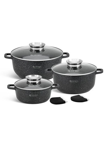 Посуда изготовлена из литого алюминия, это высококачественный, экологически чистый материал, обладающий высокой теплопроводностью, гигиеничностью и небольшим весом. Трехслойное мраморное антипригарное покрытие, не содержащее вредных PFOA веществ, обладает высокой устойчивостью к истиранию, царапинам и другим механическим повреждениям. Благодаря своему составу, такое покрытие легко мыть.