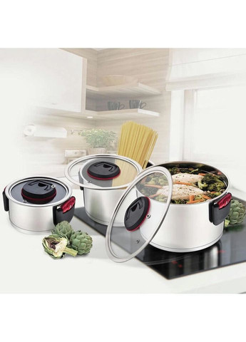 Набор посуды BOLLIRE TRIESTE. В наборе 3 кастрюли и 3 крышки. Материал: нержавеющая сталь AISI 201. Крышки: жаропрочное стекло с пароотводом. Ручки: металлические, крепление на заклепках. Пятислойное энергосберегающее капсульное дно, толщина 5 мм. Толщина стенок - 0.5мм. Размеры: кастрюля с крышкой - 16х9,5 см, объём 1.5 л; кастрюля с крышкой 20х11.5 см, объём 3 л; кастрюля с крышкой 24х13.5 см, объём 5.1 л