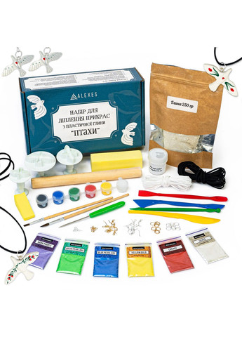 Хотите создавать стильные украшения самостоятельно? Набор для лепки из пластичной глины поможет вам сделать уникальные аксессуары легко и с удовольствием! Идеально для подарка. Покупайте уже сегодня! Состав набора: Глина пластичная самозастывающая 500 грамм. Замечательная мягкая, удобная и очень пластичная масса для лепки на основе природной глины. Изделия застывают на воздухе в течение суток (без дополнительного обжига). Экологична и безопасна даже для детей. Набор из 4-х стеков для моделирования изделий. Набор акриловых красок - 12 цветов. Треугольный спонж - 1 шт. Кисточки 2 шт. Акриловый глянцевый лак 10 мл. Деревянная скалка - 1 шт. Набор из 8 плунжеров для легкого создания основных форм. Фурнитура для изготовления украшений. Замшевые стильные шнурки белого и черного цветов, швензы для сережек, соединительные кольца и штифты с резьбой. Все металлические элементы представлены в двух цветах: серебро и золото, что поможет сделать украшения на любой вкус. Шило 12,5 см. - 1 шт. Пилочка-баф для обработки изделий - 1 шт. Перламутровый пигмент для лака и краски - 6 цветов. Инструкция с советами и секретами для успешного создания ваших собственных шедевров! Произведено в Украине! Инструкция и советы: Подготовьте рабочее место, застелите поверхность пергаментом, бумагой или возьмите удобную пластиковую доску. Отделите небольшую часть глины, остаток герметично заверните и закройте, чтобы избежать преждевременного высыхания. Тщательно размягчите глину в руках и раскатайте с помощью деревянной скалки. Не делайте изделия слишком тонкими! Для изготовления форм можно воспользоваться набором плунжеров. Плунжер состоит из ручки с выталкивателем и вырубкой. Раскатайте глину и прижмите плунжер вырубкой к ней. Отделите лишнюю глину и нажмите на поршень, осторожно отделите готовую форму от плунжера. Также можно лепить любую форму самостоятельно. Не бойтесь экспериментировать и фантазировать! Сделайте отверстия для шнурков или вставьте штифт с резьбой, после застывания он будет прочно держаться в изделии. Пока глина не застыла, изделия можно подкорректировать и сгладить с помощью смоченного в воде спонжа или кисточки. Оставьте ваши украшения в сухом теплом месте на 24-48 часов. После застывания вы можете усовершенствовать поверхность изделий с помощью пилки-бафа и дополнить фурнитурой. По желанию можно раскрасить ваши украшения и покрыть лаком. В лак или краску можно добавить немного перламутрового пигмента, это придаст вашим изделиям больше сияния и яркости. Воплощайте идеи в реальность – лепите, декорируйте, носите!